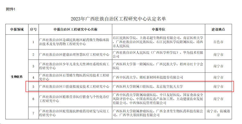 近日,广西壮族自治区发展和改革委员会印发《关于认定2023年度广西壮族自治区工程研究中心的函》(桂发改高技函〔2023〕2727号),由我校口腔医学院牵头、与北京航空航天大学合作共建的“广西壮族自治区口腔虚拟现实技术工程研究中心”成功获批,实现了我校口腔医学学科在省级科技创新平台建设的再次突破。