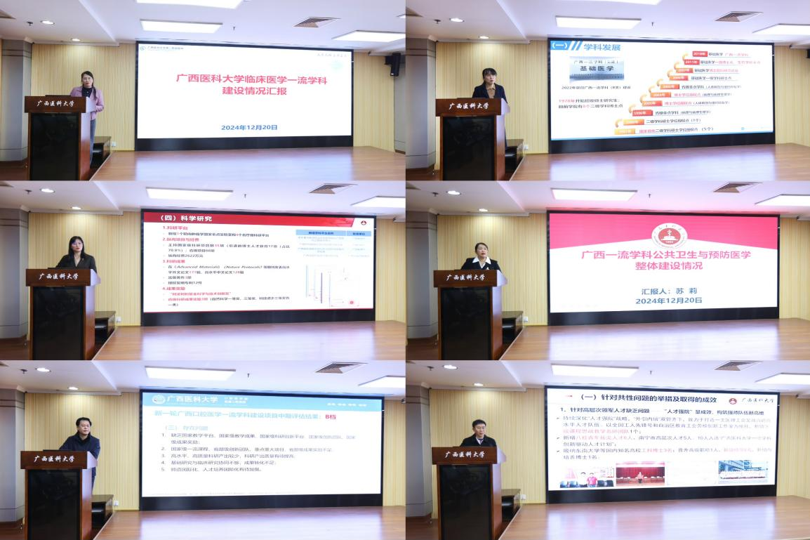 beat365手机版官网入口处首先作一流学科建设工作报告,汇报了今年6个一流学科建设大讨论整体情况、一流学科建设主要发展成效和存在问题,同时对标世界一流大学和一流学科排行榜、ESI学科排名、国家学位评估、我国“双一流”建设等国内外学科评价指标体系,分析我校广西一流学科与国家一流学科的建设差距,着眼国内一流、国际著名医科大学新发展目标提出下一步学科建设努力方向。接着,6个一流学科依次汇报学科建设大讨论活动成果,聚焦广西一流学科建设项目中期评估反馈问题,提出明年加快落实完成建设任务的工作思路和具体措施。职能部门围绕人才引育、平台建设、成果培育、师资建设等方面如何进一步全面深化改革,支撑助力一流学科建设开展研讨交流。