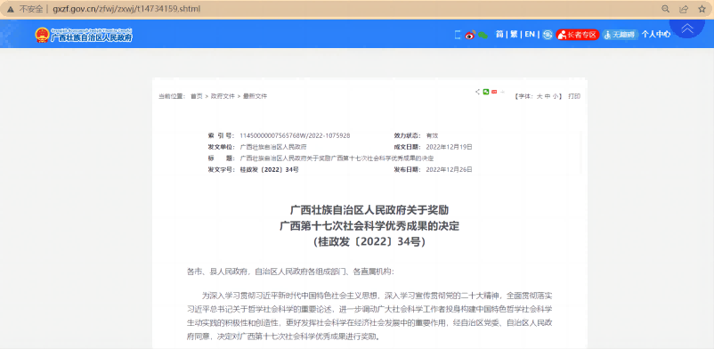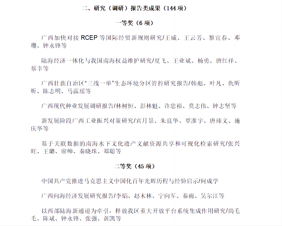 据了解,广西社会科学优秀成果奖是广西哲学社会科学领域的最高奖项,是自治区党委、政府激励广大哲学社会科学工作者多出精品力作的重要举措,每两年评选一次。