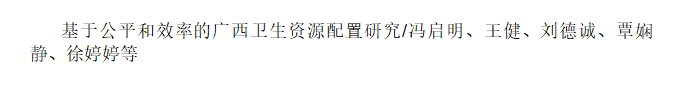 研究报告《基于公平和效率的广西卫生资源配置研究》,分析了2005—2019年广西卫生资源的总量、结构和分布,评价其与全国、东中西部平均水平的差距,测算其公平性和配置效率,总结了配置水平和存在问题,直接为广西深化医药卫生体制改革“十四五”规划编制项目提供了循证依据。