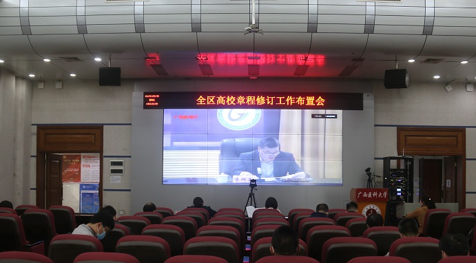 自治区教育厅首先传达教育部关于启动新一轮高校章程修订工作的文件精神,强调了新一轮高校章程修订工作的背景和重要性,并就我区高校章程修订工作的总体进度安排进行了说明。随后,伍锦昌副厅长从“既定章程实施情况”、“章程修订原因”、“章程修订内容”、“章程如何修订”等四个方面进行动员部署讲话。他指出,学校章程是办学治校的“总规矩”和根本制度,是促进学校教育事业快速发展、增强依法治校意识的重要保障。他强调,章程修订工作要准确把握内容表述,既要凸显新时代、新法规、新改革以及新阶段的要求,又要突出凝炼学校办学特色,把加强党的全面领导、落实立德树人根本任务、学校新的发展定位和目标以及将学校“十四五”事业beat365手机版官网入口等内容融入章程,确保适应性、规范性、前瞻性的有机统一,切实提高章程文本修订质量。